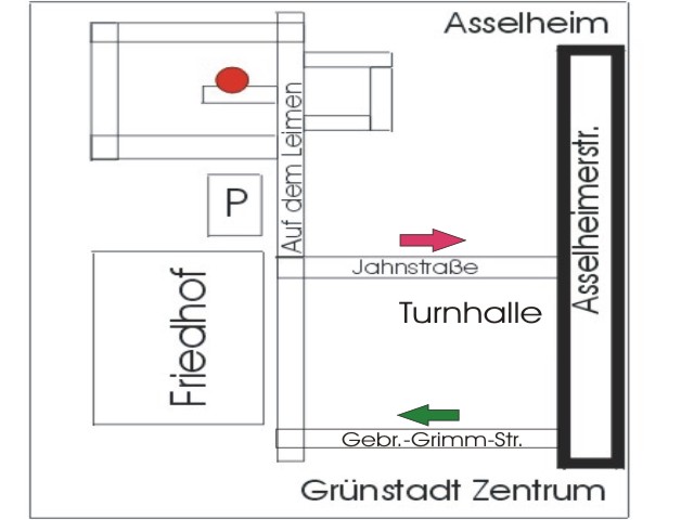 Sie fahren ab von der A6 Abfahrt Grünstadt/Bad Dürkheim. Im Kreisverkehr in Richtung Grünstadt Zentrum. Sie folgen der Hauptstraße durch den Ort hindurch und biegen kurz vor dem Ortsausgang Richtung Asselheim direkt nach der LVM- Agentur auf der linken Seite links in die Gebrüder-Grimm-Str. ein (Einbahnstr.). Die Rückfahrt erfolgt über die Jahnstraße (Einbahnstr.). Hinter dem Friedhof beginnt "Auf dem Leimen" Sie biegen in die zweite Straße links ein. Ziel erreicht!
